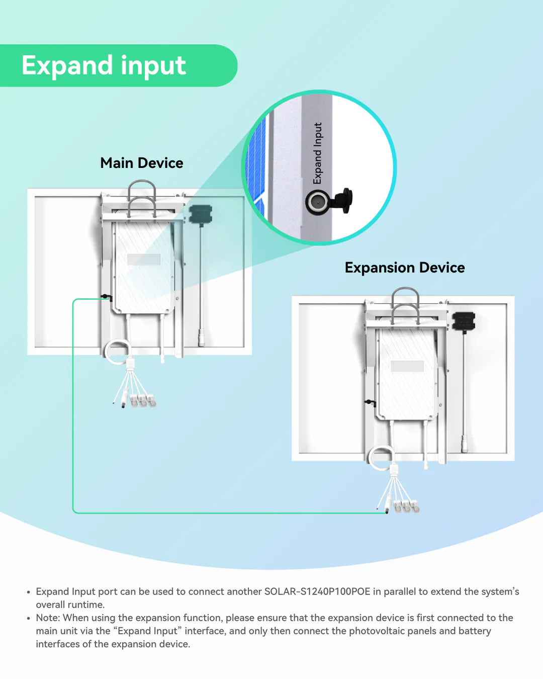 - EXPAND INPUT PORT - it can be used to connect another SOLAR-S1240P100POE in parallel to extend the system’s overall runtime.