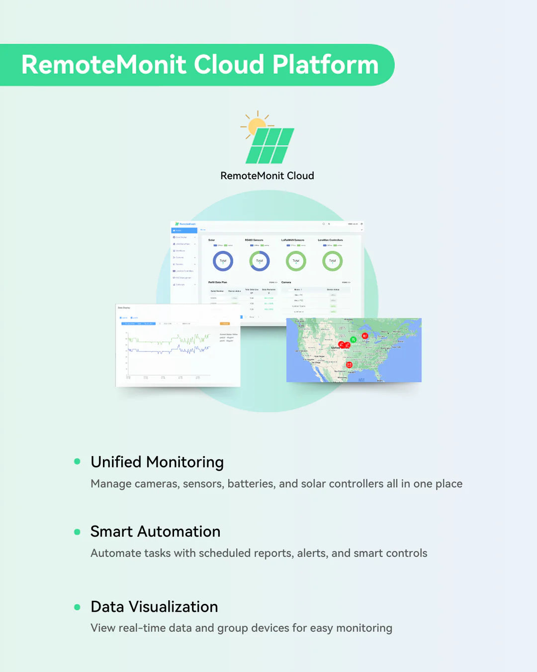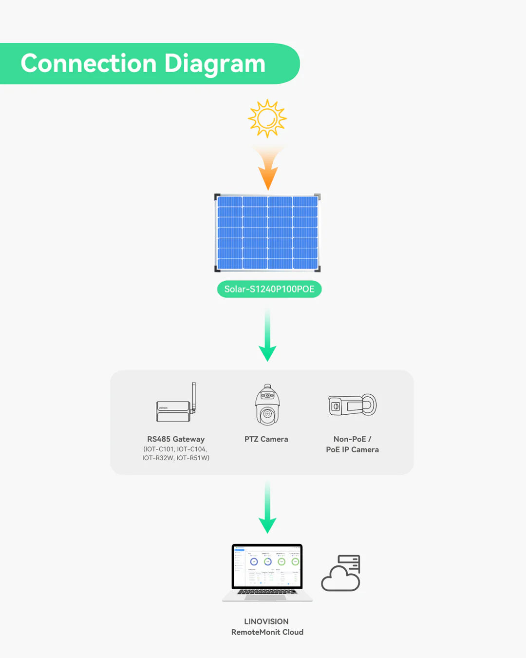 - REMOTE MONITORING - Provide RS485 for remote charge status monitoring when connecting the SOLAR-S1240P100POE to a RS485 to TCP gateway such as IOT-C101 or IOT-R32W.