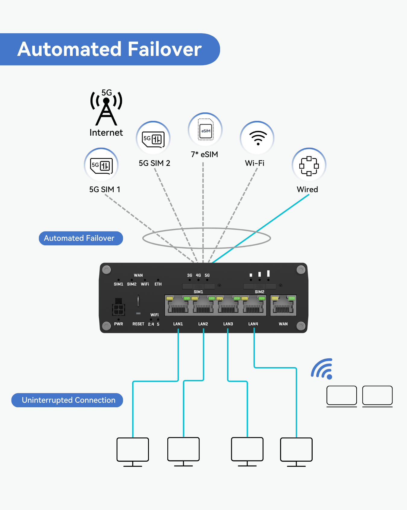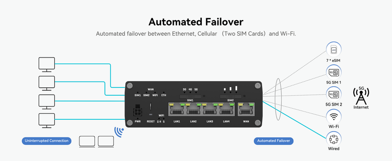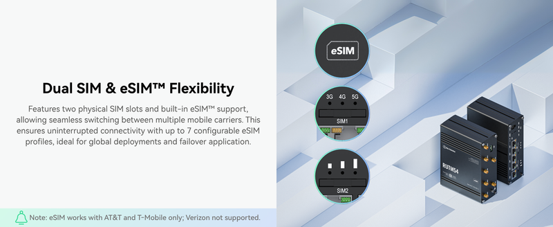 • AUTOMATIC FAILOVER- Supports Dual SIM cards and Consumer-type eSIM for a robust and flexible cellular connection. Enables automated failover between Ethernet, Cellular (SIM/eSIM), and Wi-Fi.(The eSIM supports profile download and removal operations, with up to 7 eSIM profiles.Data plans are not included.)
