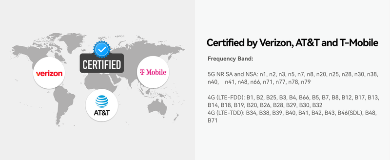 • CERTIFIED BY VERIZON, AT&T and T-MOBILE - Supports advanced 5G and LTE Cat 19 networks for compatibility and performance across major U.S. carriers.