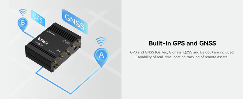 • BUILT-IN GPS AND GNSS - GPS and GNSS (Galileo, Glonass, QZSS and Beidou) are included. Capability of real-time location tracking of remote assets.