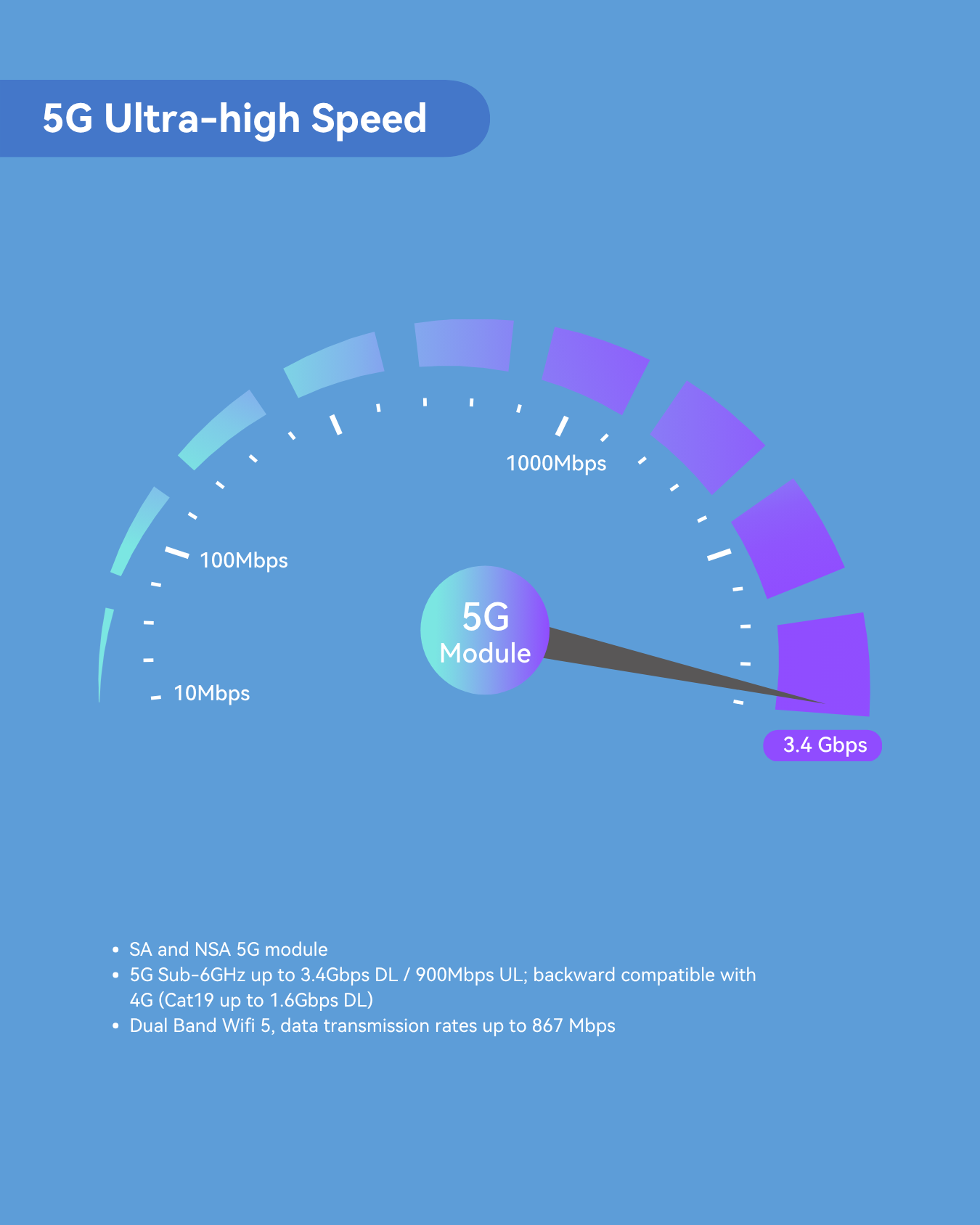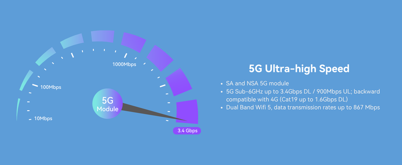 • INDUSTRIAL 5G LTE ROUTER- Teltonika RUTM54 supports SA and NSA 5G module, support ultra-high speed (3.4Gbps DL/900Mbps UL) ; built-in LTE CAT19/18, backward compatible with 4G Network (1.6Gbps DL/211Mbps UL). Dual band Wi-Fi 5 compliance with 802.11b/g/n/ac standard, data transmission rates up to 867Mbps.