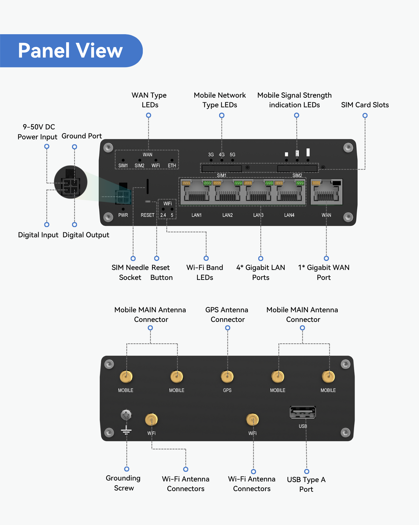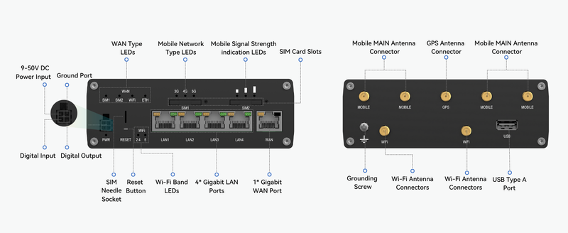 • 5 GIGABIT ETHERNET PORT - Provide 1x 10/100/1000 Mbps WAN port(configurable as LAN), 4 x 10/100/1000 Mbps LAN ports, 1x DI, 1xDO, 1 x USB A port.